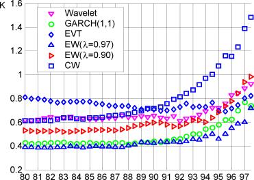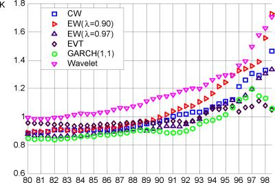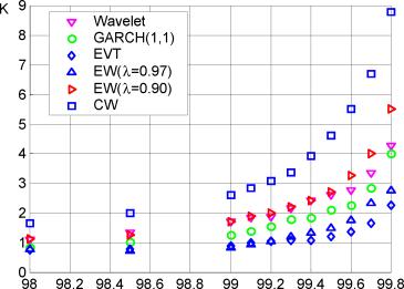 Из полученных результатов (см. табл. 7-8) можно сделать следующие выводы: если сравнивать значения множителя по рынкам для каждой из моделей, то выделяются модели, у которых присутствует явная тенденция к ухудшению результатов по мере усложнения рынка: они переоценивают риск при уровне достоверности 95% и недооценивают при 99% (CW,EW и в некоторой степени GARCH), а также модели с относительно стабильными характеристиками - EVT и Wavelet.