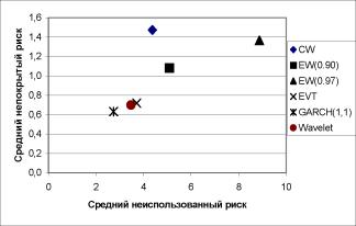 По этим графикам можно определить парето-оптимальные модели, когда считается, что модель доминирует другую, если имеет меньший непокрытый и неиспользованный риск.