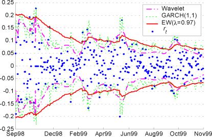 1) На нормальном рынке FX при умеренных значениях уровня достоверности (до 97%) все модели практически одинаково пригодны для использования с точки зрения точности модели. Наиболее точными являются модели EW97 (0.97 - оптимальный параметр для этого рынка), GARCH и EVT (для этого рынка распределение Вейбулла практически совпадает с нормальным).