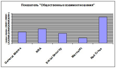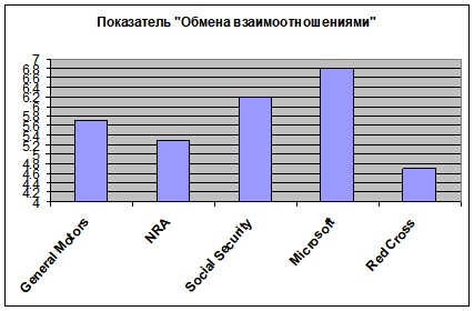 Для компаний General Electric и Майкрософт категория «обмен взаимоотношениями» была выше, чем категория «общественные взаимоотношения», но однако не настолько высока, как у NRA. GE, фигурирующая в списках журнала Fortune на первом месте по корпоративной репутации, имела по результатам опроса, более сильный показатель общественных взаимоотношений, чем Майкрософт, и более слабый показатель «обмена взаимоотношениями», чем эта же компания. Существует мнение, что все считают, корпорации склонны выстраивать отношения только на возмездных основаниях – с потребителями или же со стейкхолдерами, например. Также важно принимать во внимание, что корпорации вынуждены использовать обменные взаимоотношения, чтобы выжить. Поэтому не следует интерпретировать исключительно негативно эти высокие показатели. Но в то же время также подразумевается, что специалисты пиар в хороших компаниях стремятся продемонстрировать, что компания озабочена благосостоянием людей и общества в целом, поэтому с этой точки зрения GE оказалась более успешной, чем Майкрософт.