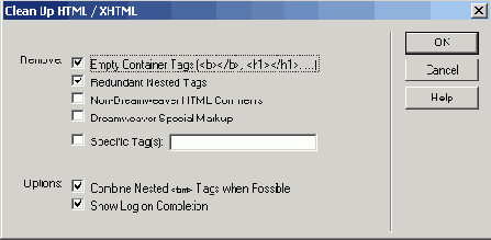 Задав нужные параметры (в подавляющем большинстве случаев можно оставить заданные по умолчанию), нажмите кнопку ОК для запуска процесса "чистки" или Cancel — для отказа от нее. "Чистка" может занять довольно много времени, особенно если Web-страница сложна, а компьютер, на котором установлен Dreamweaver, маломощен. По окончании, если был включен флажок Show Log on Completion, на экране появится окно статистики, где будет описано, что сделал Dreamweaver в процессе "чистки". В нашем случае (рис. 3.59) ничего сделано не было — HTML-код нашей страницы и так был "чист". Закройте это окно нажатием кнопки ОК.