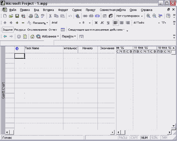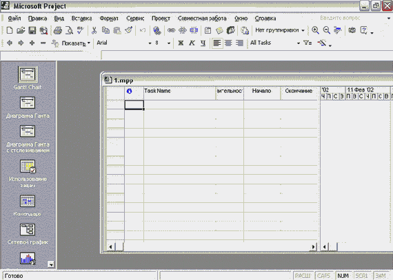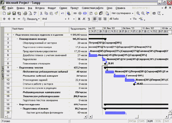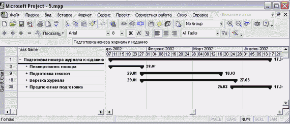 В MS Project диаграмма Ганта (Gantt Chart) является основным средством визуализации плана проекта. Эта диаграмма представляет собой график, на котором по горизонтали размещена шкала времени, а по вертикали расположен список задач (рис. 5.2, файл 1.mpp). При этом длина отрезков, обозначающих задачи, пропорциональна длительности задач. При наведении мыши на любой элемент диаграммы отображается всплывающая подсказка.