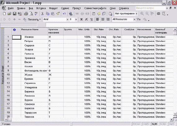 Чтобы применить сортировку, следует воспользоваться подменю Project > Sort (Проект > Сортировка). В этом подменю (рис. 4.1, файл 1.mpp) содержится набор стандартных вариантов сортировки для текущего типа таблицы.