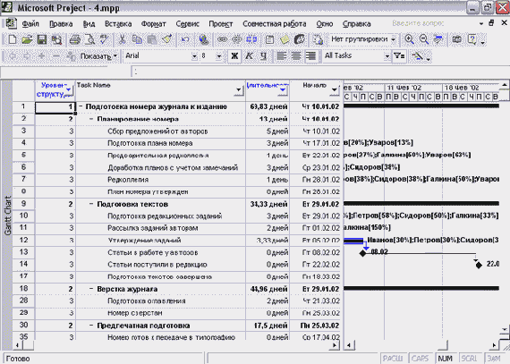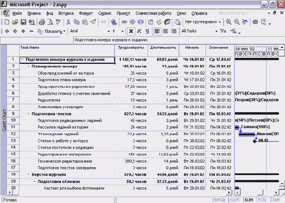Для изменения даты начала и окончания задач нужно навести мышь па середину отрезка, чтобы курсор принял форму креста с четырьмя стрелками, и перетащить ее вправо или влево1. Чтобы увеличить или уменьшить длительность задачи, нужно подвести курсор к правому краю отрезка, чтобы он принял вид полосы со стрелкой вправо, и перетащить край отрезка вправо или влево. А если подвести курсор к левому краю задачи, то он примет вид полосы со знаком процента, и перетаскивая его можно определить процент выполнения задачи.