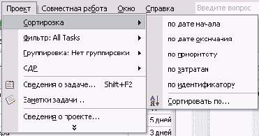 Если в таблице отображается информация о задачах, то в меню будут представлены следующие варианты сортировки: by Start Date (по дате начала), by Finish Date (по дате окончания), by Priority (по приоритету), by Cost (по затратам) и by ID (no идентификатору). Если же в таблице содержатся данные о ресурсах, то в меню будут представлены варианты сортировки by Cost (по затратам), by Name (по названию) и by ID (по идентификатору).