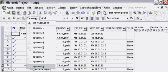 Структурная фильтрация осуществляется с помощью команды меню Project > Outline > Show (Проект > Структура > Показать). При этом открывается список уровней вложенности задач (Outline Level (Уровень)) — от 1 до 9 (рис. 4.3, файл 1.mpp).