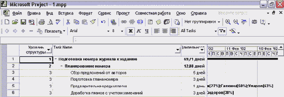 Проектный план имеет структуру, или уровни вложенности. Есть задачи, находящиеся на верхнем уровне проекта, а также задачи, расположенные «внутри» фаз, их подфаз и т. д.