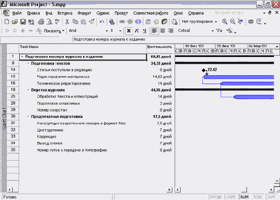 Просматривать сводную информацию обо всех задачах фазы удобно, когда на диаграмме отображаются только отрезки фаз, а отрезки задач скрыты (рис. 5.20, файл 7.mpp). Когда же на диаграмме видны задачи, составляющие фазу, то потребность в сводной информации отпадает. Для того чтобы убирать сводную информацию из отрезка фазы, когда отображаются входящие в нее задачи, служит флажок Hide rollup bars when summary expanded (Скрывать сведенные отрезки при развертывании суммарных задач).