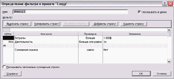 В MS Project есть возможность создавать фильтры, запрашивающие значение для сравнения при каждом запуске (например, минимальную стоимость работ по задаче). Для того чтобы создать такой интерактивный фильтр, нужно в поле Value(s) (Значения) указать в кавычках текст, который фильтр будет выводить в качестве вопроса, и знак вопроса, например так: «Минимальная стоимость задачи:»?.