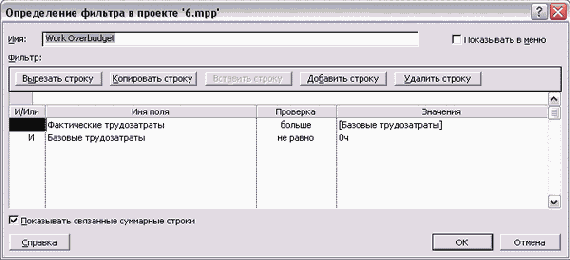 И последний столбец, Value(s) (Значения), определяет, с каким значением при проверке условия сравниваются данные из столбца Field Name (Имя поля). В качестве значений могут выступать как произвольные величины, вводимые вручную, так и значения других столбцов таблицы. Например, на рис. 4.15 первое условие фильтра требует, чтобы отбирались задачи, стоимость работ по которым составляет более $1000. А на рис. 4.16 (файл 6.mрр) фильтр для отбора задач, стоимость которых превысила бюджет, отсеивает их, сравнивая реальный объем работ с изначально запланированным.