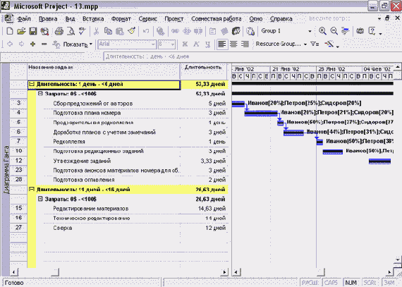 В счетчике Group interval (Интервал группировки) указывается значение интервала. Укажем здесь 5, как мы и планировали. Нажмем кнопку ОК и, вернувшись в диалоговое окно определения параметров группировки, снова нажмем кнопку ОК. Теперь таблица сгруппирована по-новому (рис. 4.25, файл 10.mрр). Верхнюю группу с задачами длительностью менее 1 дня на рис. 4.25 мы свернули, используя значок рядом с ее названием, чтобы она не отвлекала наше внимание от групп с более продолжительными задачами.