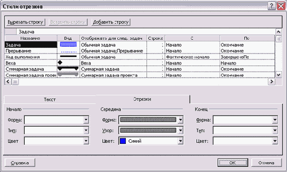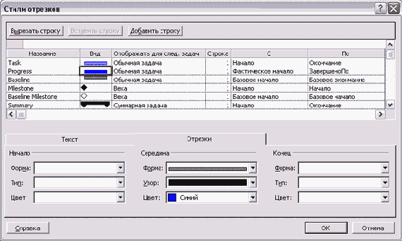 Групповое форматирование элементов диаграммы позволяет полностью настраивать вид диаграммы, определяя, какая именно информация из проектного файла и каким образом отображается на диаграмме. Для этого в диалоговом окне определяются типы (или стили) отрезков. Каждый стиль соотносится с определенным типом задач и имеет свои параметры представления на диаграмме.