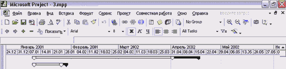 Для представления больших проектов часто требуется продемонстрировать только фазы плана, не детализируя его до уровня задач. Отформатируем диаграмму таким образом, чтобы на ней отображались только фазы проекта, причем рядом справа и слева от отрезков фаз отображались даты начала и окончания фазы.