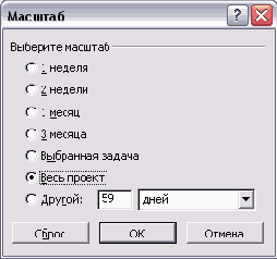 Диалоговое окно масштабирования временной шкалы в зависимости от числа дней из плана проекта, которые должны отобразиться в окне MS Project