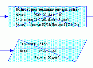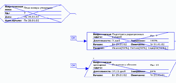 Блоки графика могут различаться цветом и формой в зависимости от типа задачи (обычная задача, завершающая задача или фаза) и ее состояния (выполняется, не выполняется, завершена). На блоке может быть указана любая дополнительная информация, например на рис. 6.1 это название задачи, даты начала и окончания, длительность и задействованные ресурсы. На этом сетевом графике параллелепипедами обозначены фазы, прямоугольниками — задачи, а многоугольниками — завершающие задачи. Начатые задачи перечеркнуты одной линией, а завершенные — двумя. Стрелки соответствуют связям между задачами. Рядом. со связями указывается их тип.
