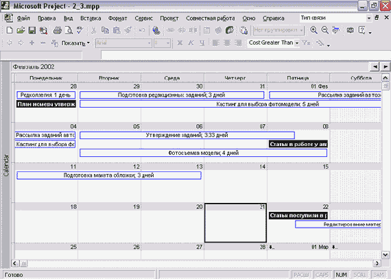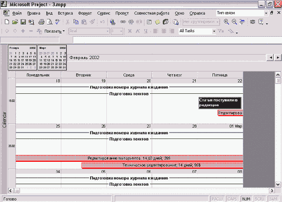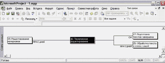 Удалить задачу можно нажатием клавиши Delete. Связи между задачами создаются перетаскиванием мыши с одной задачи на другую, как и в диаграмме Ганта. Двойной щелчок на связи открывает уже знакомое нам по диаграмме Ганта диалоговое окно редактирования свойств, в котором можно и удалить связь.