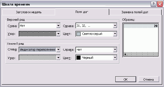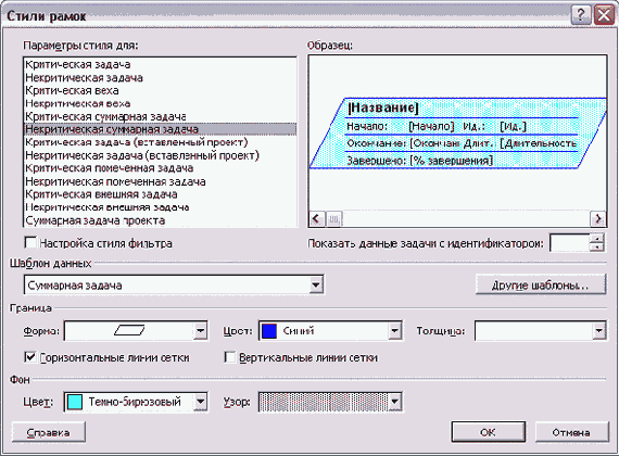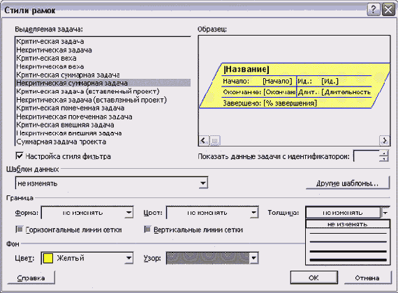 Для того чтобы какой-либо из параметров оформления блока изменялся при подсвечивании фильтром, нужно сменить в соответствующем списке пункт No Change (Не изменять) на другое значение. Например, на рис. 6.10 в списке Color (Цвет) раздела Background (Фон) установлено значение Yellow (Желтый). Это значит, что у задач, попадающих под условие фильтрации, цвет фона будет меняться на желтый. Аналогично и с параметром Pattern (Узор) — у подсвеченных задач заливка будет меняться на установленную в диалоговом окне.