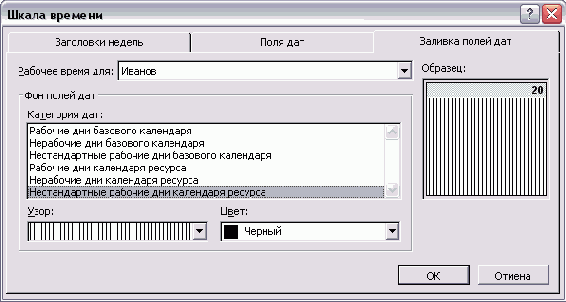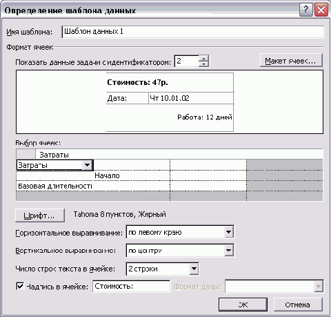 Чтобы определить, каким шрифтом будут отображаться данные в ячейке, нужно выделить ее и нажать кнопку Font (Шрифт). Отобразится стандартное для MS Project диалоговое окно определения свойств шрифта, в котором можно осуществить нужные настройки. Выбранные настройки отображаются рядом с кнопкой (например, на рис. 6.5 выбран шрифт Tahoma размером 8 пунктов полужирного начертания).