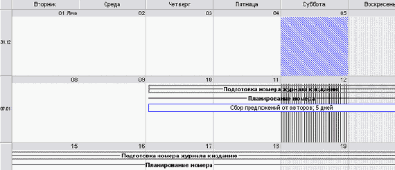 Блоки графика могут быть сориентированы относительно друг друга в зависимости от даты начала работ. В таком случае график делится на колонки, соответствующие единице измерения (день, неделя, месяц), и тогда задачи, начинающиеся в один и тот же момент (день, неделю, месяц), будут находиться в одной колонке. Размер блоков с длительностью задач при этом не соотносится.