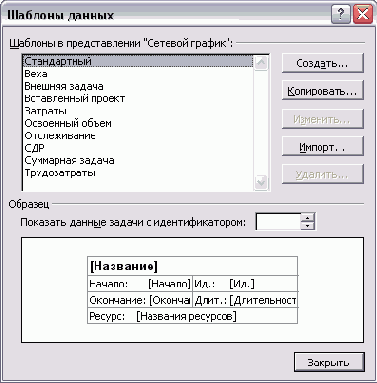 Верхний раздел этого диалогового окна (рис. 6.4) по структуре аналогичен подобным разделам в окнах со списками таблиц, фильтров и пр. В нем находится список шаблонов и кнопки для доступа к их редактированию. Ниже располагается область предварительного просмотра, в которой отображается соответствующая выбранному в списке шаблону структура блока графика. Над ней расположено поле Show data from task ID (Показать данные задачи с идентификатором), в котором можно выбрать номер задачи из плана проекта, после чего в области предварительного просмотра шаблон заполнится данными этой задачи.