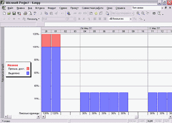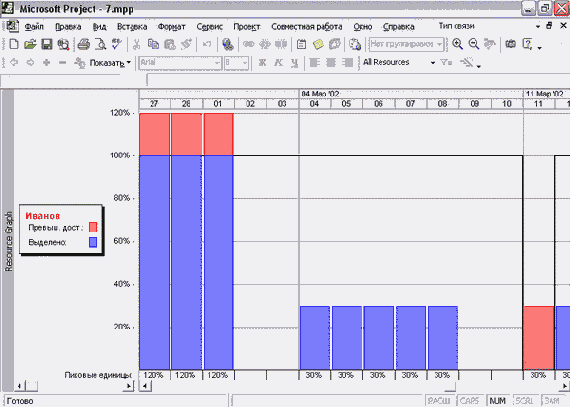 На рис. 9.3 (файл 2.mрр) светлые столбцы обозначают работу ресурса над выделенной задачей, а темные — работу над всеми остальными. При этом столбцы ресурсного графика распложены под соответствующими отрезками диаграммы Ганта.