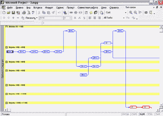 - Перейдите в представление Network Diagram (Сетевой график) и примените фильтр Учебный фильтр 1 в режиме выделения.