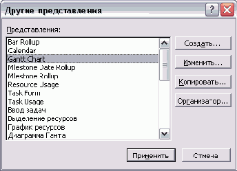 С помощью Организатора можно работать не только с представлениями и их составляющими, но и с другими объектами MS Project, которые мы еще не рассматривали, например с макросами. Но принципы работы в Организаторе не зависят от объекта, поэтому, научившись работать с Организатором сейчас, вы сможете применять свои знания в дальнейшем для работы с макросами или другими объектами.