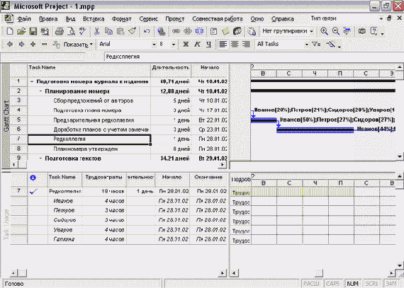 Комбинированное представление сочетает два одиночных: диаграмму Ганта и диаграмму использования задач