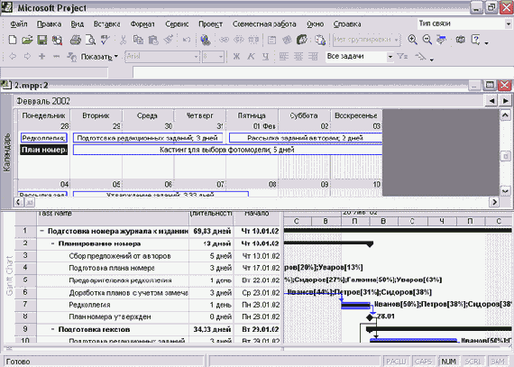 Благодаря такой связи составляющих комбинированного преставления с его помощью можно просматривать данные в разнообразных срезах. Например, па рис. 9.3 в комбинированном представлении диаграмма Ганта совмещена с ресурсным графиком (файл 2.mрр). На ресурсном графике можно просматривать информацию о работе любого из ресурсов, задействованных в выделенных на диаграмме Ганта задачах, причем работа над выделенными задачами отображается особым цветом.