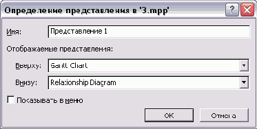 В файле З.mрр представлена настройка комбинированного представления, в котором сочетаются Gantt Chart (Диаграмма Ганта) и Relationship Diagram (Схема данных). Выбрав задачу в диаграмме Ганта, можно просмотреть все связанные с ней задачи на схеме данных.