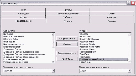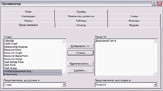 С помощью находящейся между списками кнопки Сору (Копировать) можно копировать элементы из одного списка в другой. Кнопка Rename (Переименовать) позволяет изменить название элемента (кроме некоторых стандартных, например нельзя переименовать диаграмму Ганта). Кнопка Delete (Удалить) удаляет объект, а кнопка Close (Закрыть) закрывает диалоговое окно.