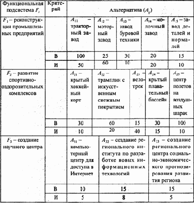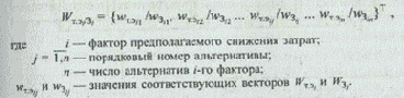 При этом в общем случае значения vijB и vijИ представляют интегральные оценки, принадлежащие вектору приоритетов элементов (альтернатив) i-й строки матрицы по экономическим, техническим, социальным, управленческим и другим факторам. Данные векторы рассчитываются для каждой строки морфологической матрицы методами анализа иерархических систем.