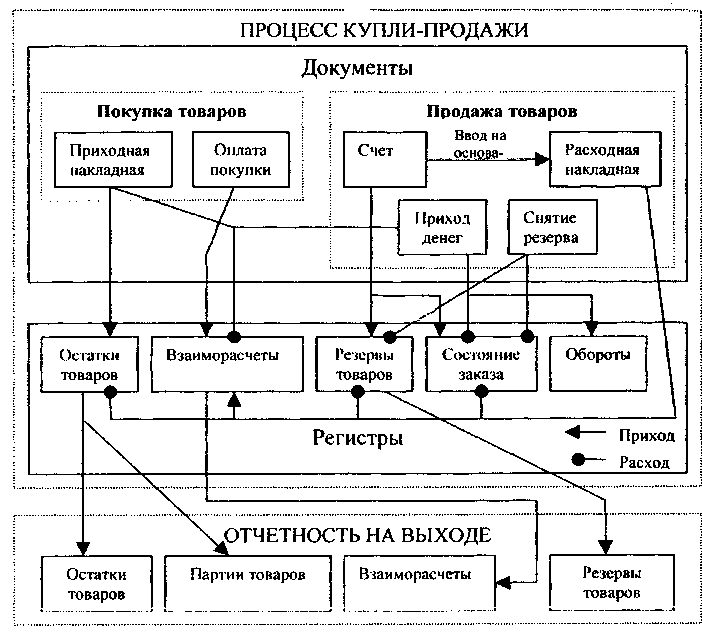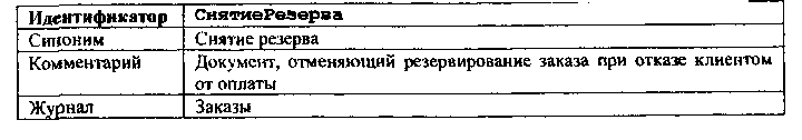 На фирме принят следующий оборот документов: покупка товара оформляется документами «Приходная накладная» и «Оплата покупки», в случае заказа товара клиентом оформляется документ «Счет», который формирует резерв товара. В случае отказа от оплаты формируется документ «Снятие резерва» по указываемым счетам. При отгрузке товара клиенту или при завершении работ на основании «Счета» выписывается документ «Расходная накладная», в которой указывается, какой товар отпускается. Поступление денежных средств от клиента фиксируется документом «Приход денег».