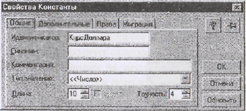 Константы - предназначены для хранения информации, относящейся ко всему предприятию, необходимой для многократного использования в печатных формах, расчетах и т. д. Информация может быть постоянной или периодически меняющейся. Использование констант облегчает изменение величин, которые используются в разных модулях и шаблонов таблиц конфигурации.