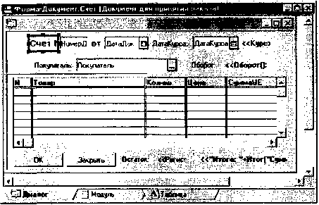 Совокупность диалога, модуля и таблицы называется формой. Для разработки форм в конфигураторе применяется комплексный редактор форм, позволяющий редактировать все компоненты формы во взаимосвязи.