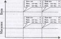 У предприятия 2 склада: база и магазин, 2 товара: нитки и иголки, товар учитывается по количеству, стоимости в рублях и валюте.