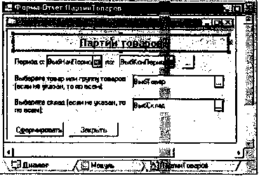 Рассмотрим связь между отчетами «Остатки товаров» и «Партии товаров». Для приема параметров из отчета «ОстаткиТоваров» мы воспользуемся атрибутом контекста формы: Форма. Параметр. Тогда предопределенная процедура ПриОткрытии {) будет выглядеть следующим образом: