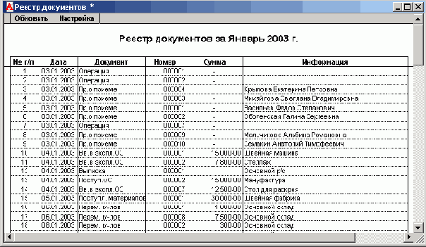 После выполнения каких-либо действий в журнале документов (например, после ввода нового документа), для приведения реестра документов в актуальное состояние достаточно дважды щелкнуть мышью кнопку «Обновить»