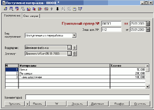 «Поступление материалов», «Передача материалов в производство», «Отгрузка материалов на сторону», «Передача готовой продукции на склад»