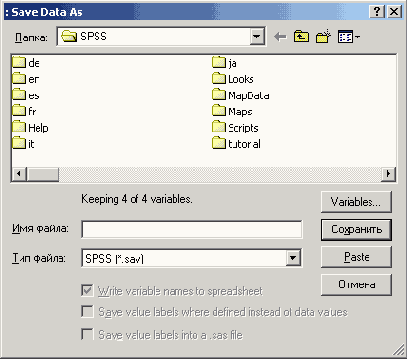 , SPSS открывает специальное диалоговое окно, в котором надо указать тип сохраняемого файла (файл данных, вывода или синтаксиса).