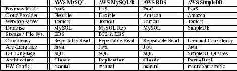На уровне приложения вариант AWS SimpleDB реализуется с использованием той же конфигурации, что и другие варианты AWS, т.е. Tomcat с переменным числом машин EC2. Поскольку в SimpleDB не поддерживается SQL, операции SQL, подобные соединению и агрегации, необходимо реализовывать на уровне приложения. Для этого мы реализовали (Java-) библиотеку с этими операциями SQL и вручную оптимизированными SQL-запросами (т.е. с выбранными порядками и методами выполнения соединений). Очевидно, что для применения этого подхода потребовалась пересылка всех требуемых данных из SimpleDB в серверы приложений, что привело к ухудшению производительности по сравнению с подходом пересылки запросов, выполняемых полнофункциональными SQL-ориентированными системами баз данных.