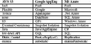 В этом разделе описываются альтернативные службы, предлагаемые тремя крупными игроками в области "облачных" вычислений – компаниями Amazon (AWS, Amazon Web Services), Google и Microsoft. Поскольку какие-либо стандарты пока еще отсутствуют, эти службы различаются во многих аспектах: бизнес-моделями, программными компонентами, используемыми на всех уровнях, и моделями программирования. Сводка различий и ключевых характеристик приведена в табл. 1. Для экспериментов, описываемых в разд. 6, наиболее уместна строка Архитектура (Architecture), и поэтому эта строка в табл. 1 выделена. Другой важной категорией является Конфигурация аппаратных средств (HW configuration). Для использования нескольких служб требуется указание нужного числа виртуальных машин, а также того, какие виды серверов должны быть установлены на этих машинах. Только в Google AppEngine аппаратные ресурсы на всех уровнях выделяются автоматически в зависимости от рабочей нагрузки. В SimpleDB и Azure ресурсы автоматически предоставляются и настраиваются на уровнях "сервера баз данных" и "системы хранения", но на уровне серверов Web и приложений требуется ручное конфигурирование аппаратных ресурсов. Компания Amazon обеспечивает службу AutoScaling, которую можно использовать для автоматического увеличения и уменьшения числа машин EC2 на уровне серверов Web и приложений. Однако мы не использовали эту службу при проведении экспериментов, чтобы иметь возможность управлять ими и сосредоточиться на масштабируемости на уровне баз данных.