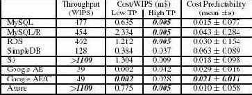 Для обеспечения стабильности результатов мы выполняли ряд дополнительных экспериментов и измерений. Для MySQL,MySQL/R, RDS и Azure все эксперименты повторялись по семь раз, и в результаты включались средние значения WIPS и стоимости, полученные при каждых семи прогонах. Из-за бюджетных ограничений для вариантов SimpleDB, S3, Google AE (с кэшированием и без кэшироввания) все эксперименты повторялись только по три раза. Кроме того, мы прогоняли несколько частных вариантов тестового набора (при фиксированном числе EB) в течение более долгого времени (до тридцати минут), чтобы оценить, смогут ли службы настроить свою конфигурацию к имеющейся рабочей нагрузке. Однако нам не удалось выявить таких эффектов. Только при использовании Microsoft Azure мы наблюдали небольшую разрывность. В наших первых экспериментах служба Azure быстро становилась недоступной при EB=2000 и EB=5500. Мы полагаем, что в эти моменты времени службы Azure перемещали базу данных TPC-W на более крупные машины, чтобы можно было справиться с возрастающей рабочей нагрузкой. Этот эффект наблюдался только при выполнении самого первого эксперимента с использованием Azure.