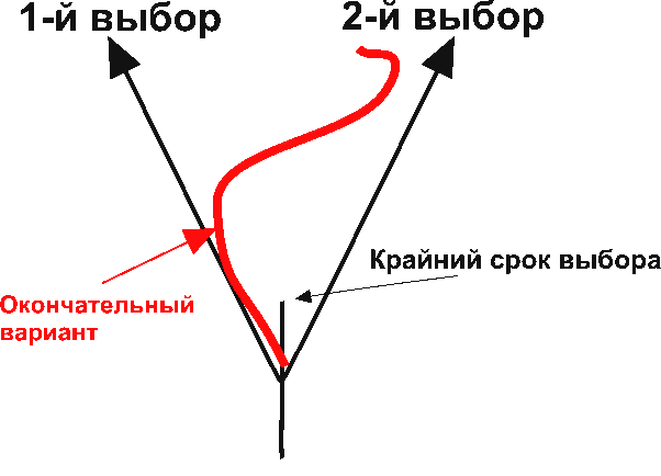 Теперь у вас есть отрезок времени от сегодняшнего дня и до этого момента. И на этом отрезке времени определите точку, в которой этот выбор был бы наиболее оптимален. И из этой точки проведите вторую линию времени, соответствующую второму выбору.