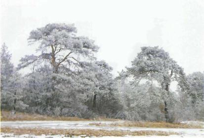 Сосны в редколесье. Под слоем инея характерные причудливые формы сосен становятся особенно заметными
