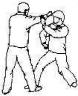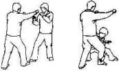 Противник атакует правым кулаком. Вы блокируете удар своей левой рукой с внешней стороны и прижимаете руку оппонента вниз и внутрь. Одновременно сделайте шаг левой ногой вперед, и правой рукой нанесите удар в пах снизу вверх.