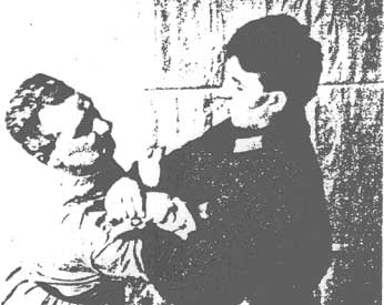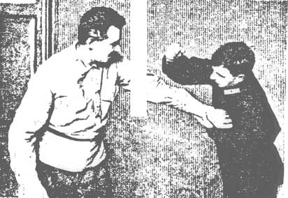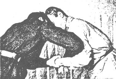 Второй способ загиба руки за спину очень редко может удасться первым приемом в тренировке, но он особенно ценен при невозможности довести загиб руки за спину первым способом, когда противник зашел влево или захвативший уклонился вправо (в этом случае прием продолжать дальше невозможно). (Рис. 57). Тогда необходимо быстро перенести правую руку к кисти противника и поднырнуть под нее, т.е. начатый загиб руки за спину первым способом - приходится доканчивать вторым способом. (См. рис.