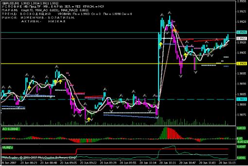 Особо осторожным и нервным трейдерам нужно достаточно спокойно реагировать на транспорант " РАЗВОРОТ MVREV в критической зоне !!!", и иметь в виду, что, во-первых, разворот системой трактуется в широком смысле: как прекращение тренда, т.е. незначительные откаты и коррекции допускаются, во-вторых, раннее закрытие прибыльной позиции не позволит получить полную прибыль, в-третьих, при сильных движениях, поскольку в это время наблюдается высокая активность рынка, этот транспорант как раз "горит". Когда "горит" этот транспорант, надо смотреть на ценовой график, обращая внимание на появление последнего фрактала, и на индикатор AO.