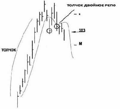 Примечание: Этот сигнал один из немногих случаев, когда вы полностью разворачиваетесь в своей первоначальной позиции. Возможно и агрессивное вхождение в рынок (открытие новой позиции) на максимуме сигнального бара Несостоявшегося Двойного РеПо даже после самого небольшого отката. Дело в том, что этот сигнал — сигнал Направления. Не играйте с ним. Сойдите с его пути и следуйте за ним! На Рисунке 6-10 мы отчетливо видим Двойное РеПо, которое терпит неудачу, превышая на откате точку "*". Оказавшись на длинной стороне рынка, вы имеете два места выхода. Точка "СОР" (не показана) могла бы быть вашей расчетной точкой получения прибыли по Фибоначчи. Пересечение при закрытии в обратную сторону ниже 3x3 - ваш защитный ордер на выход из рынка. Этот защитный стоп способен принести вам прибыль или убыток в сделке в зависимости от того, когда и где цена пересекает 3x3. Еще вы можете использовать методы размещения стопов, обсуждаемые в ГЛАВАХ 8-11. Независимо от тактики, сигнал остается в силе, пока не достигнута существенная целевая Точка Разумной Прибыли, или вы не получаете Подтвержденный сигнал Тренда, направленный против ожидаемого курса Движения.