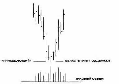 Этот Индикатор Направления похож на "Растяжку" тем, что вам нужна сильная поддержка Фибоначчи в точке, где происходят еще какие-то события. В данном случае такое событие возникновение "Приседающего" (Squat). Что такое "Приседающий"? По определению моего друга и коллеги Билла Вильямса (Bill Williams)4, "Приседающий" функция диапазона данного ценового бара и объема, или тикового объема, наблюдающегося во время формирования этого диапазона. Основная идея в том, что большой объем и малое движение цены указывают на существенную поддержку или сопротивление. Некоторые "старички" могут вспомнить термин "маслобойка" ("churning").